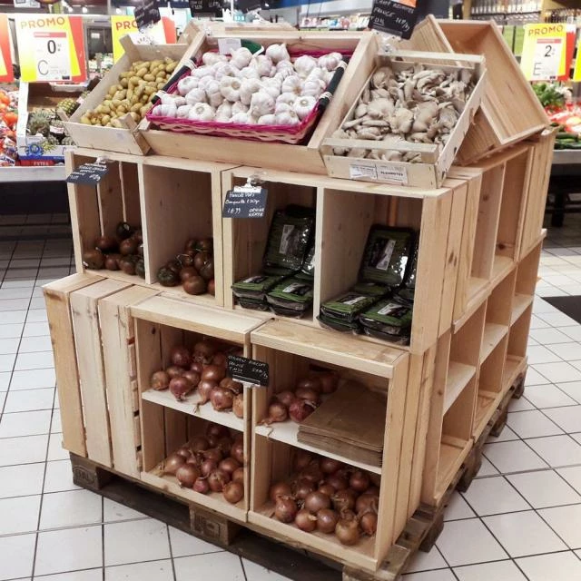 Nous avons repris l’esprit des anciennes caisses en bois de fruits et légumes utilisées autrefois pour vous proposer des produits qui s’adaptent au mieux à votre boutique et vos besoins.