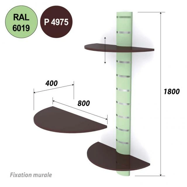 Finition des colonnes : acier avec laque époxy ral 6019 brillante + tablettes en médium laqué Pantone 4975 satin.