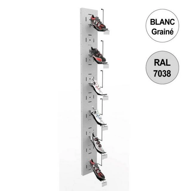 Ensemble composé d’un panneau avec perforations carrées et 6 supports chaussures indépendants.